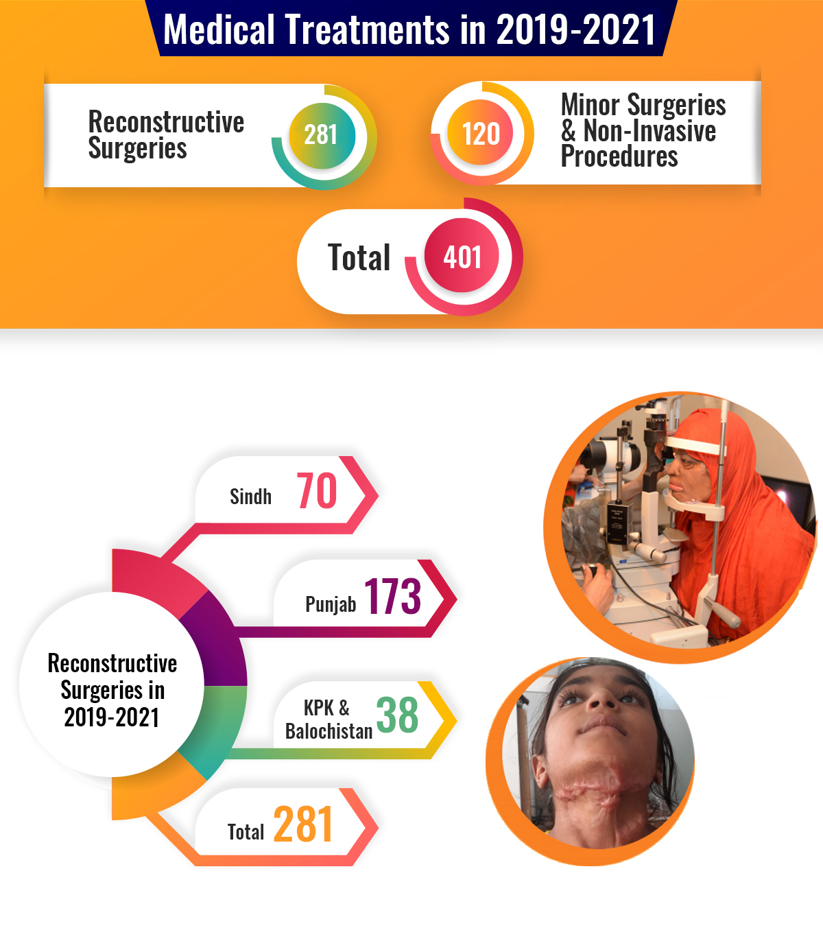 Depilex Smileagain Foundation (DSF) is committed to help victims of acid and kerosene oil burns in Pakistan by providing them appropriate medical attention and reconstructive surgeries. This involves registration of victims, checkup, medical treatment and follow up. Arrange checkup of registered patients to prioritize and schedule the required treatment regularly. Victims are registered from across Pakistan many of them have either been successfully treated or are at different stages of their treatment. Depending on the intensity of the burns some victims have to undergo multiple surgeries.